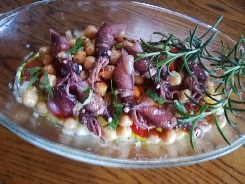 Marinated salad of firefly squid and chickpeas. The rosemary and mint were grown in my garden. The firefly squid fishing season, a spring tradition, is in full swing. Firefly squid usually live in deep seas, but in spring they approach coastal areas to spawn. Two reasons are thought to be why firefly squid glow: “protection” and “communication.” Firefly squid can be infected with Anisakis parasites, so it’s best to avoid eating them raw. Most firefly squid sold at supermarkets are pre-boiled, so it’s safe to eat them raw.