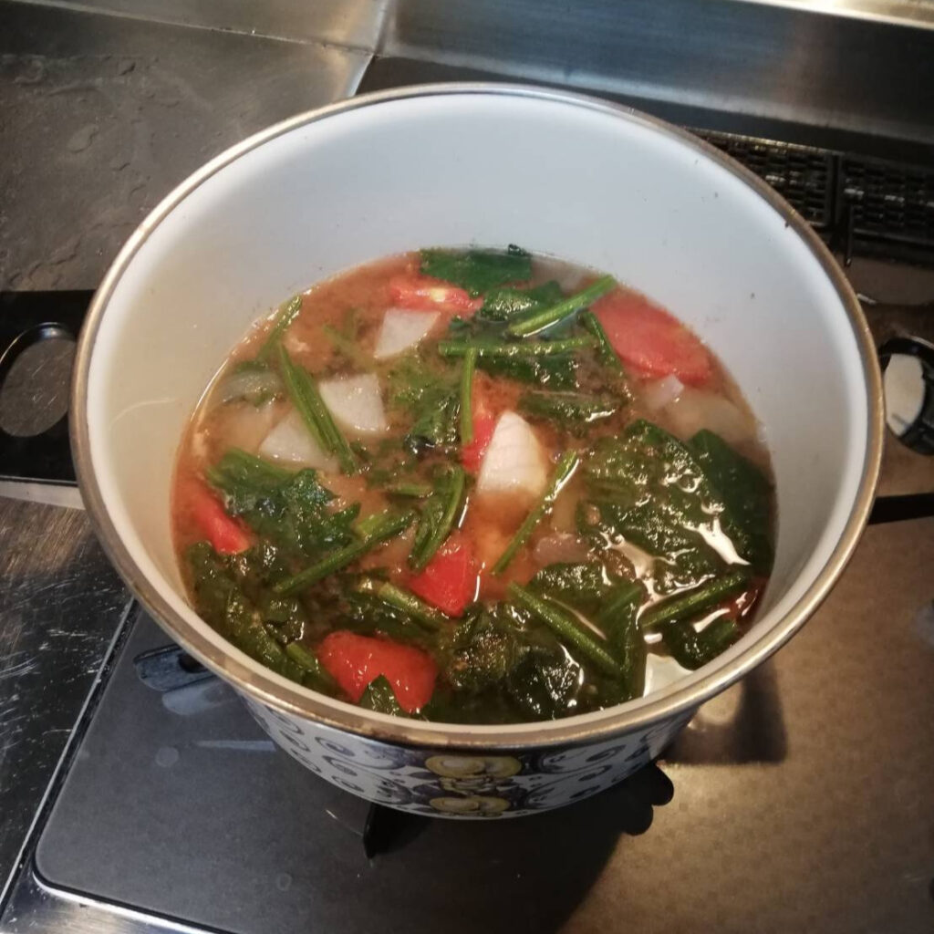 Sinigang na Swordfish. Swordfish was caught by a Taiwanese tuna fishing vessel. Sinigang is a Philippine sour soup. Tamarind (also known as sampalok) is used as the main seasoning. Shrimp or Spanish mackerel are often used, but I changed the fish. I added green beans, radish, tomato, spinach and lemon.