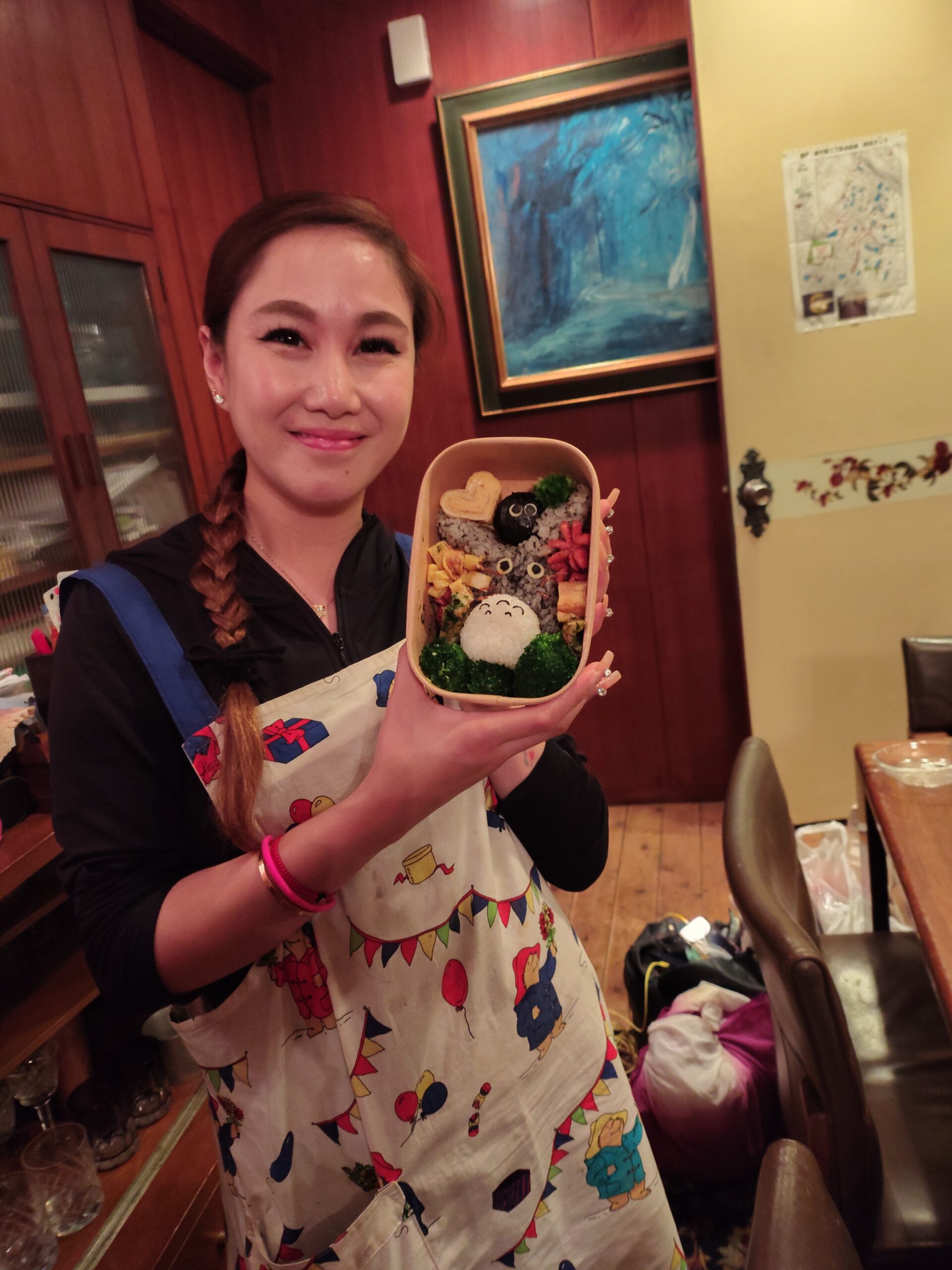 Totoro Character Bento (Chara Ben). It is a very popular menu among inbound tourists. A little difficult to make, but when you finish, it is amazing. A guest from the Philippines actively participated. She was so delighted. We can also make Mickey Mouse and Pokemon Character Bento. Participation fee 4,000 yen per person.